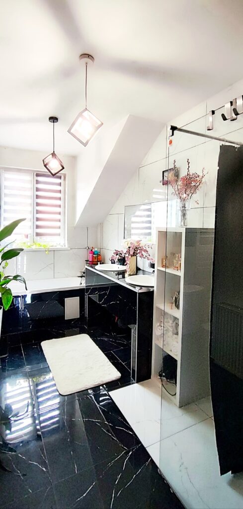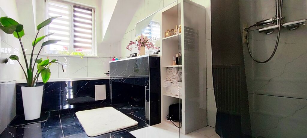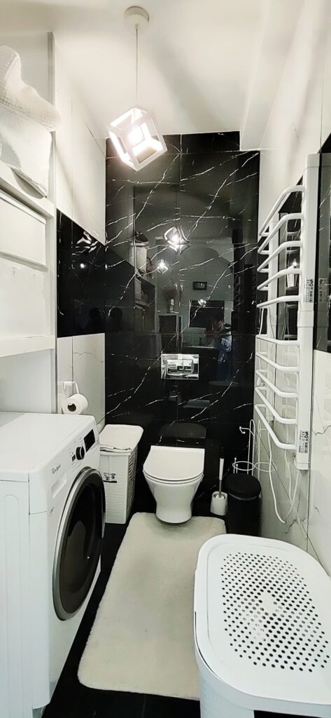 Elegancka łazienka – połączenie wanny i prysznica, wc, stylowa ceramika, zabudowa z miejscem na pralkę i suszarkę