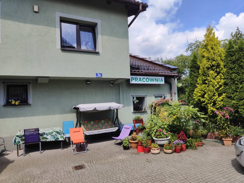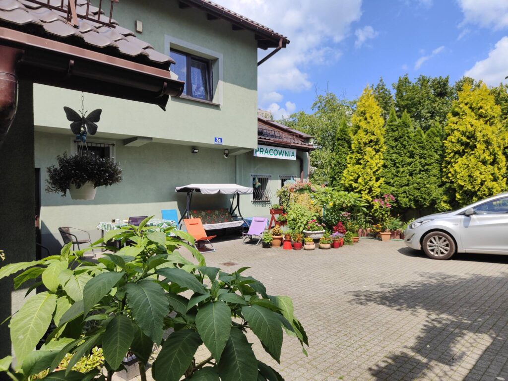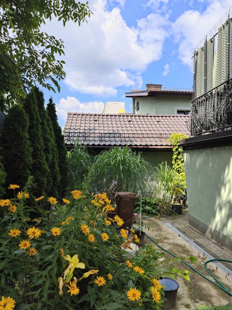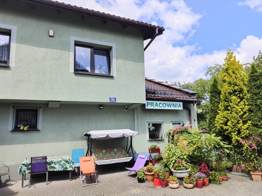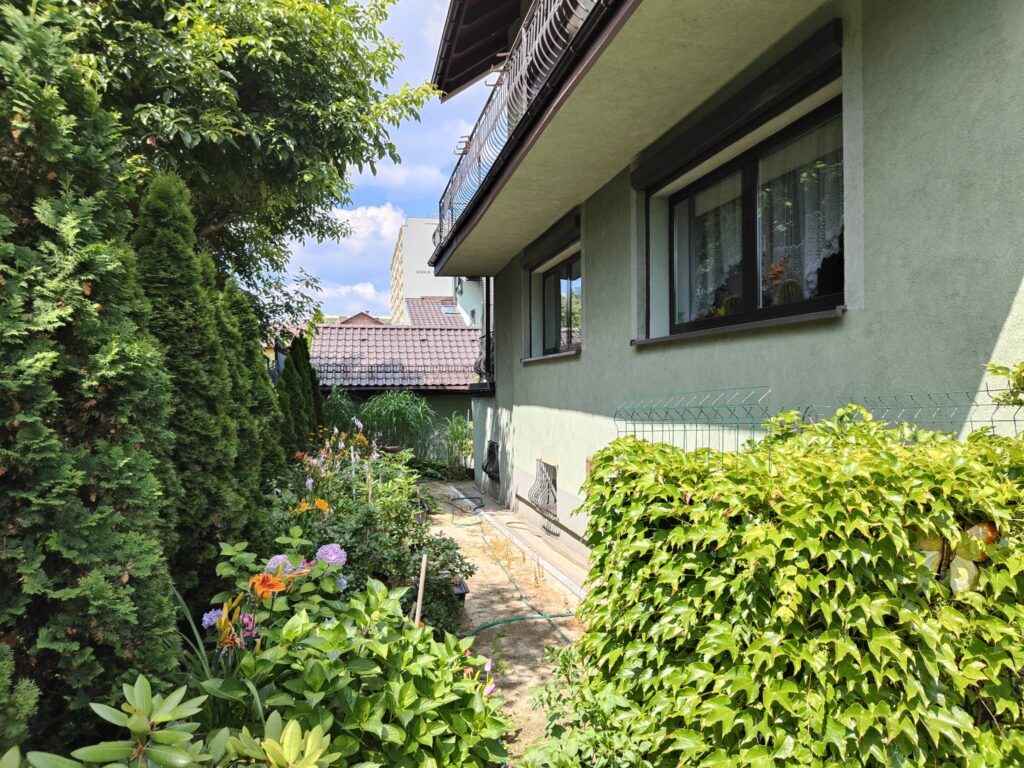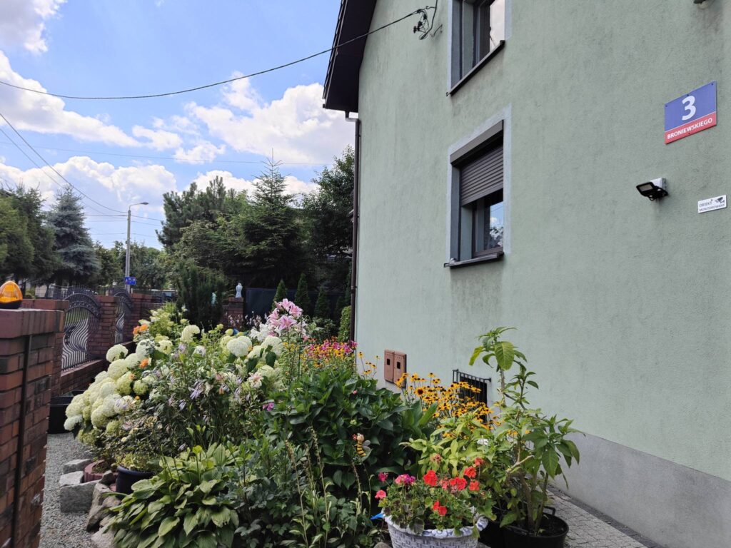 Obok budynku znajduje się ogródek z miejscem na strefę wypoczynkową oraz przestronny taras. Wzdłuż ogrodzenia posadzony jest rząd tui, które zapewniają separację od sąsiadów i tworzą prywatną przestrzeń. Na terenie posesji znajduje się kilka naziemnych miejsc postojowych.