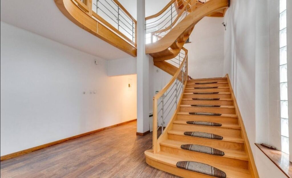 Na pierwsze piętro prowadzą nas przestronne drewniane schody gdzie znajdziemy balkon, przestronną łazienkę (12m2) oraz dwa pokoje (22 m2 i 18m2).